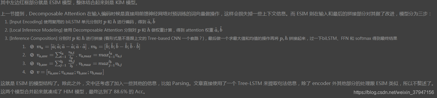 - https://hsiaoyetgun.github.io/2018/08/06/Natural-Language-Inference-%E5%AD%A6%E4%B9%A0%E7%AC%94%E8%AE%B0/#KIM-amp-DMAN