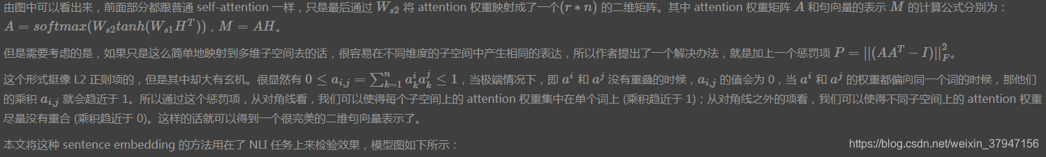 A Structured Self-Attentive Sentence Embedding 是发表在 ICLR2017 上的一篇文章,其本质上是对输入序列做 self-attention 操作,与普通 self-attention 不同的是,这篇文章的做法是将得到的 attention 权重扩展到了 rr 维,这样就得到了一个二维的句向量表示 (r×n)(r×n)。其实也就是将原本的 (1×n)(1×n) 的 attention 权重映射到了 rr 个不同的子空间上。