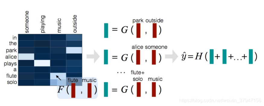 本文的模型主要分成三个部分:Attend,Compare,Aggregate。如下图所示: