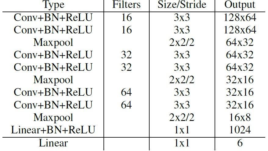 由上式可以看出,转置矩阵 H 只有6个参数,因此H-Net的输出是一个 6 维的向量。H-Net 由 6 层普通卷积网络和一层全连接网络构成,其网络结构如图所示: