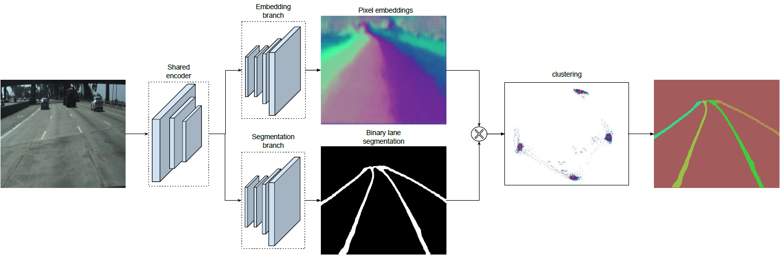 论文中将实例分割任务拆解成语义分割(LanNet 一个分支)和聚类(LanNet一个分支提取 embedding express, Mean-Shift 聚类)两部分。如上图所示,LanNet 有两个分支任务,分别为 a lane segmentation branch and a lane embedding branch。Segmentation branch负责对输入图像进行语义分割(对像素进行二分类,判断像素属于车道线还是背景);Embedding branch对像素进行嵌入式表示,训练得到的embedding向量用于聚类。最后将两个分支的结果进行结合利用 Mean-Shift 算法进行聚类,得到实例分割的结果。