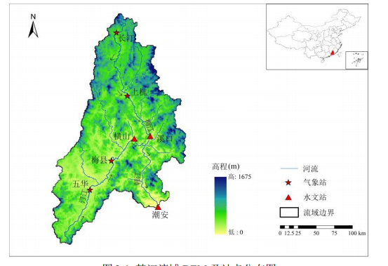 韩江流域DEM及站点分布图