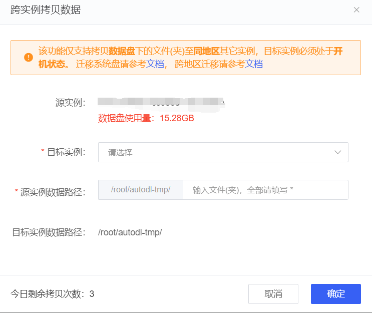 此时我们已经租了新实例并打开,接下来在旧实例那边点击跨实例拷贝数据,找到刚刚新建的新实例,输入*将tmp数据盘文件全部拷贝到新实例