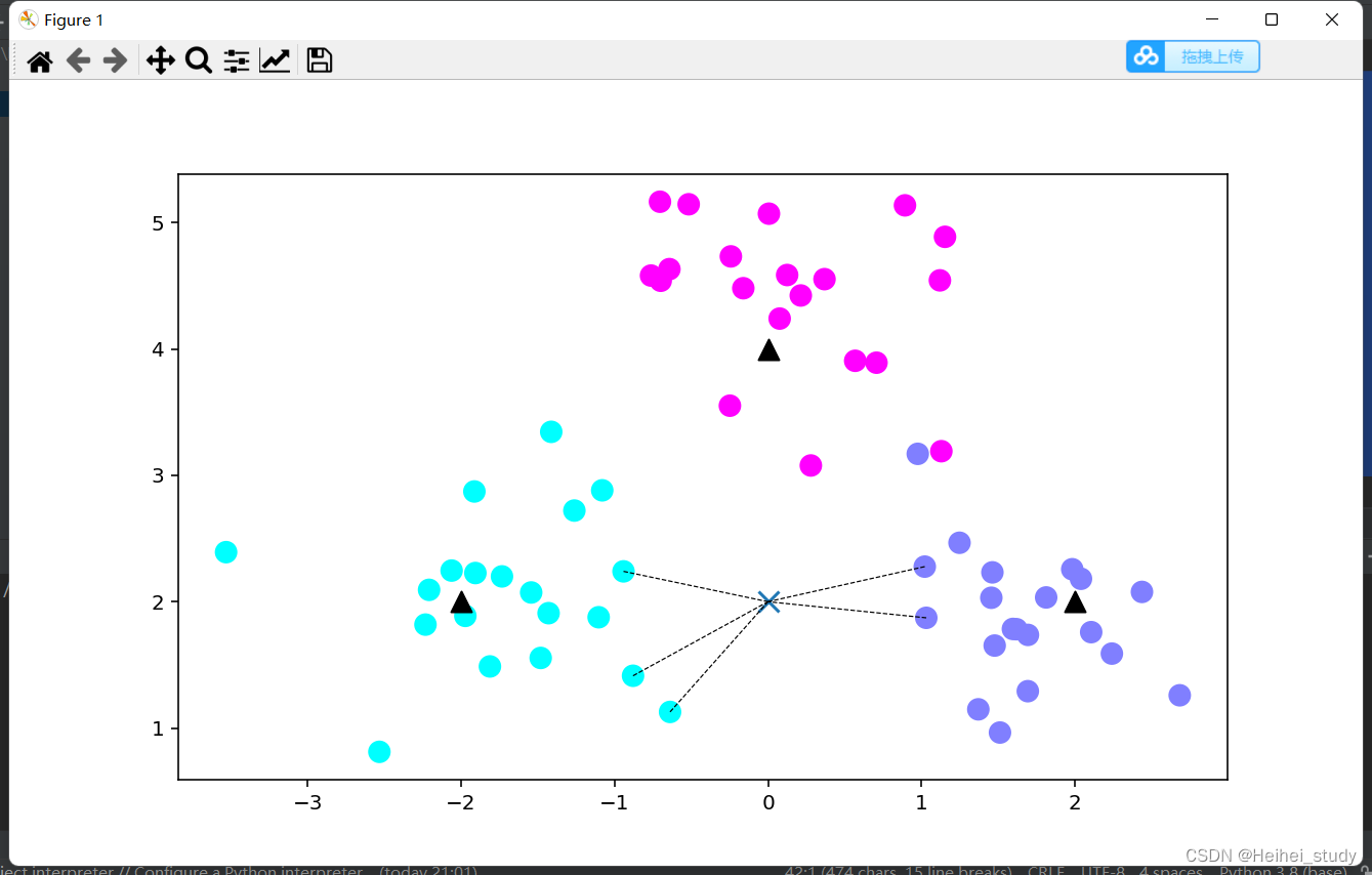 构造用于测试的的数据集,在这里y_sample使用了predict函数,得到的是分类结果集合,neighbors是用于测试的数据与他相邻的点的下标。构造出X数据集,y是分类集,做中心点分别为[-2,2],[2,2],[0,4]的三个分类,在最后将X和y打印出来可以看到。对于任何 p ,使用的是闵可夫斯基空间(l_p)p = 1, 相当于使用曼哈顿距离 (l1),用于kneighbors查询的默认邻