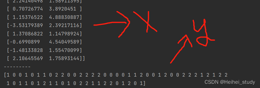构造出X数据集,y是分类集,做中心点分别为[-2,2],[2,2],[0,4]的三个分类,在最后将X和y打印出来可以看到