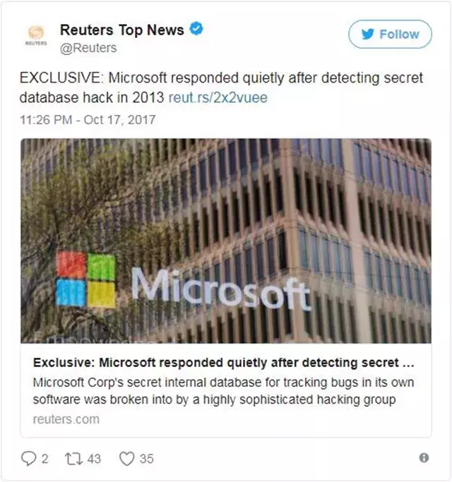据路透社独家报道称,微软内部拥有一个数据库,里面包含了各种Windows漏洞,有些外界已经知晓,而有些是大家不知道的,保密级别在他们内部最高的,但是就是这么一个数据库,竟然在4年多以前遭到手段高明的黑客团伙入侵。