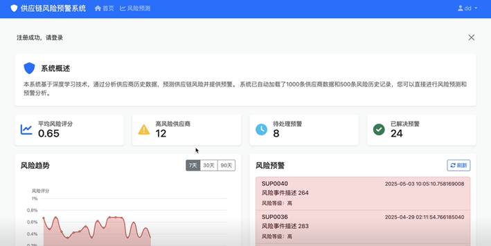 该系统首页界面实现了多个功能模块,包括系统概述、平均风险评分、高风险供应商、待处理预警、已解决预警、风险趋势以及风险预警列表。系统概述模块简要介绍了系统基于深度学习技术,通过分析供应商历史数据来预测供应链风险并提供预警。平均风险评分模块显示了当前的平均风险水平,帮助用户快速了解整体风险状况。高风险供应商模块列出了存在较高风险的供应商数量,提醒用户关注这些供应商。待处理预警模块展示了尚未处理的预警数量,促使用户及时采取行动。已解决预警模块则显示了已经解决的预警数量,反映了系统的处理效率。风险趋势模块通过图表形式展示了风险评分的变化趋势,帮助用户直观地理解风险的发展态势。风险预警列表模块详细列出了具体的预警事件,包括事件描述和时间戳,使用户能够详细了解每个预警的具体情况。通过这些功能模块的组合,系统为用户提供了一个全面的风险管理和监控平台。系统首页的具体实现图如图5-2所示。