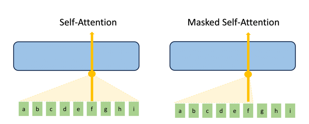 Fig. 5: Self-Attention and Musk Self-Attention: a normal self-attention block allows a position to attend to all words to its right, while masked self-attention prevents a position from attending to words that come after it in the sequence.