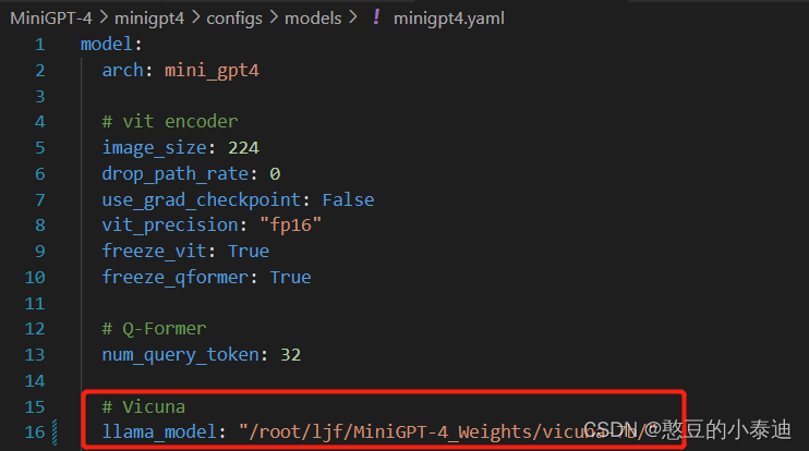 修改 MiniGPT-4/minigpt4/configs/models/minigpt4.yaml 配置文件中的 llama_model 为第4步生成 Vicuna 权重的存放地址:
