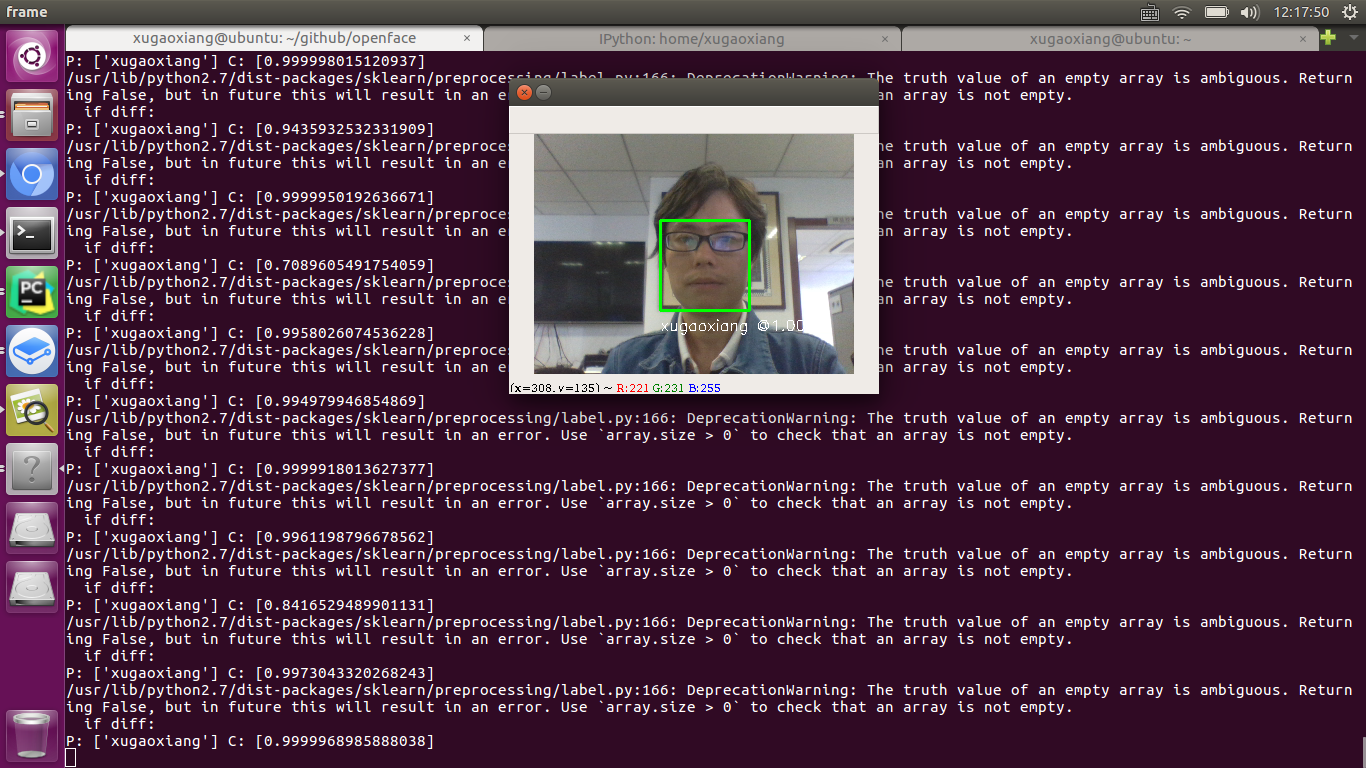 在ubuntu系统下用cheese(sudo apt install cheese)摄像头工具录制一段15秒左右的视频,然后利用ffmpeg(同样利用apt安装)工具将视频转化成图片,将生成的图片集合存放在openface/training-images/xugaoxiang下,大概就有了400左右的样本数量了,据openface的官方说法是样本数量越大,准确度是越高的,经过简单的测试,发现的确是这样.