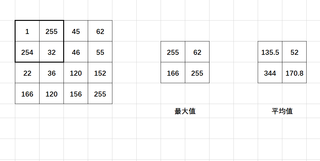 如上图展示了池化过程,池化过程的滑动窗口大小为4x4,从左到右,从上到下依次滑动,在不重叠的情况下,可获得最大池化后的输出结果,获得均值池化的输出结果如上。