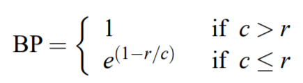 其中,r是一个参考翻译的词数,c是一个候选翻译的词数,BP代表译句较短惩罚值。