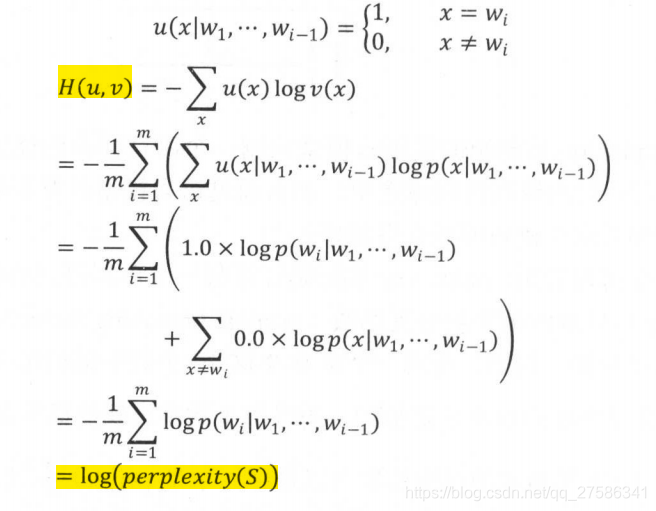 ,就可看出 log perplexity和交叉熵是等价的。 区别在于,由于语言的真实分布是未知的,真实分布用测试语料的取样代替,即认为在给定上文的条件下,语料中出现单词