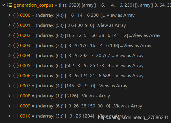 >>>generation_corpus[0] array([ 16, 14, 6, 2301])