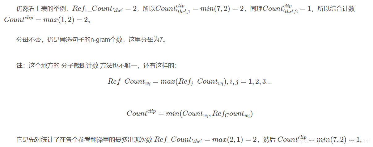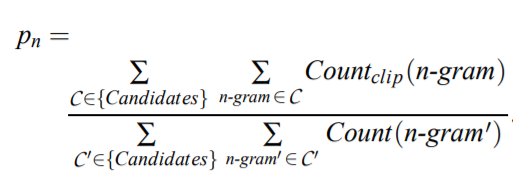 分子是一个候选翻译的单词有多少出现在参考翻译中(出现过就记一次,不管是不是在同一句参考翻译里头),分母是这个候选翻译的词汇数。