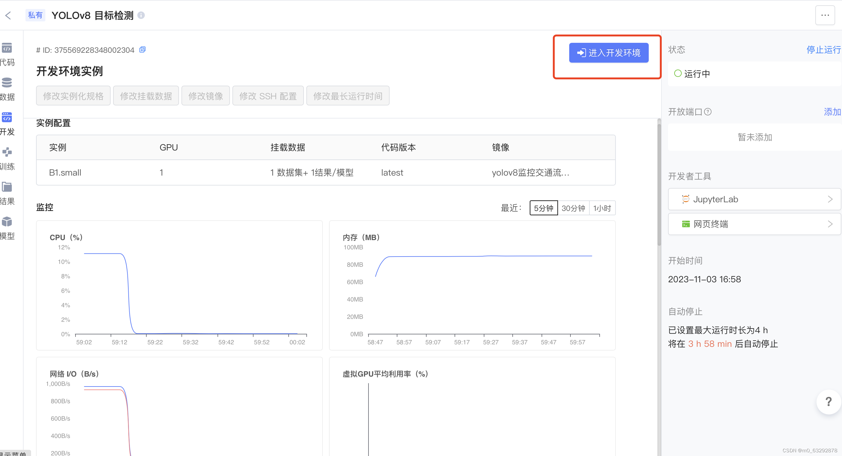YOLO系列是广受欢迎的计算机视觉算法,小编找到了一个GPU云平台,非常适合跑YOLOv8 目标检测,小编带大家体验下如何在GPU云趋动云上运行YOLOv8。开发环境运行时长达到此处设置的值后,会自动停止,避免环境空跑消耗算力金。镜像:选择 公开 镜像 yolov8监控交通流-体验镜像(作者为 “趋动云小助手”),方法参考下图。资源配置:选择 B1.small,也可选择算力大的资源规格,算力越大开