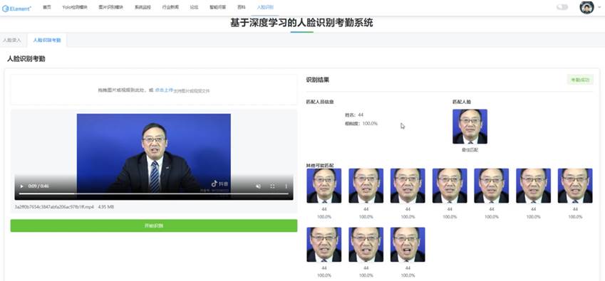 人脸识别考勤功能主要实现了自动识别和记录人员的出勤情况。左侧区域为人脸识别考勤部分,用户可以通过摄像头拍摄或上传照片进行识别。中间区域显示了识别结果,包括匹配的人员信息和相似度。右侧区域列出了其他可能的匹配结果及其相似度。考勤流程自动化程度高,能够快速准确地完成人员识别和记录工作,大大提高了考勤管理的效率和准确性。如下图所示: