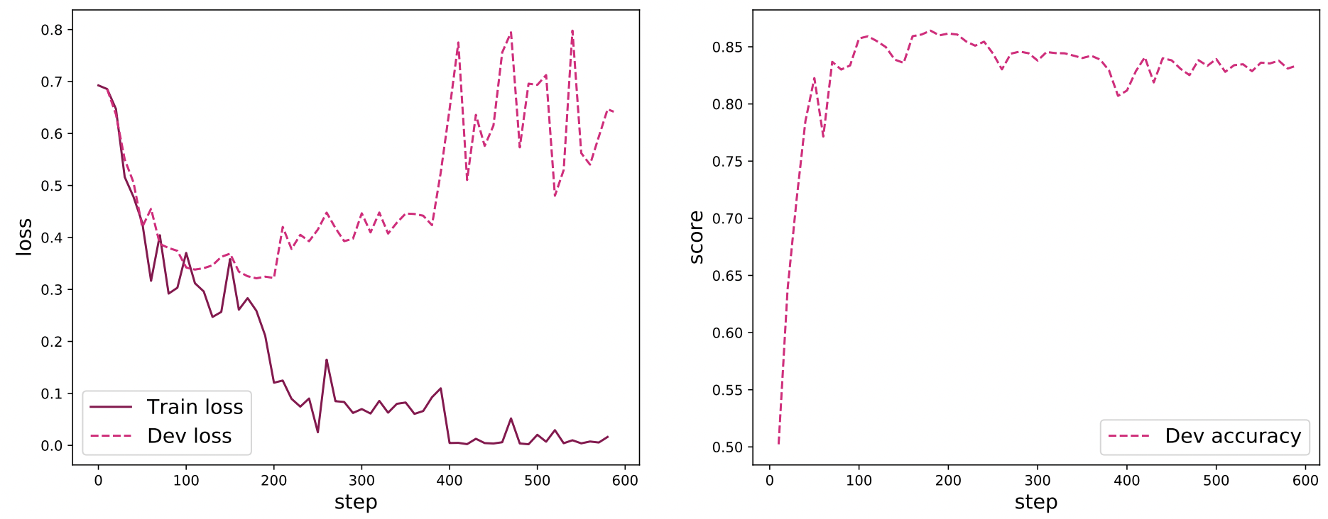 图6.16 展示了文本分类模型在训练过程中的损失曲线和在验证集上的准确率曲线,其中在损失图像中,实线表示训练集上的损失变化,虚线表示验证集上的损失变化. 可以看到,随着训练过程的进行,训练集的损失不断下降, 验证集上的损失在大概200步后开始上升,这是因为在训练过程中发生了过拟合,可以选择保存在训练过程中在验证集上效果最好的模型来解决这个问题. 从准确率曲线上可以看到,首先在验证集上的准确率大幅度上升,然后大概200步后准确率不再上升,并且由于过拟合的因素,在验证集上的准确率稍微降低。