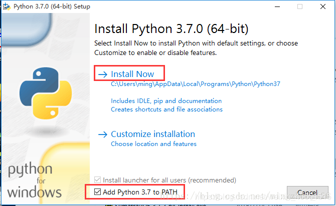 点击安装,一切需要点击确认的我感觉都可以点上,无伤大雅,因为有些版本的python可以自动安装pip这个好东西。(勾选“Add Python 3.7 to PATH”,这样会添加环境变量。)如何不点的化后期需要自己添加环境变量等。在安装安装时,如果自己的C盘东西太多,或者想把python单独拿出来放,需要自定义安装路径。自定义安装可根据自己的需要进行勾选。