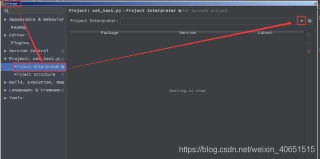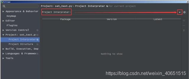 此时只需要点击“Project Interpreter”右侧的小三角下拉框,图右侧的红色小框框所示。会显示你刚刚下载的python,如果没有显示,点击show all,便可以找到。
