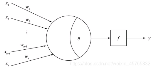 y = f ( ∑ i = 1 n w i x i − θ ) y=f(\sum^{n}_{i=1}w_ix_i-θ) y=f(i=1∑nwixi−θ)