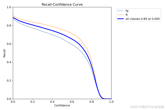 (1)2条彩色线:代表2个类别的召回率随置信度的变化情况。这条曲线显示了随着置信度的增加,每个类别的召回率先变化较小,然后在某个点之后迅速下降。