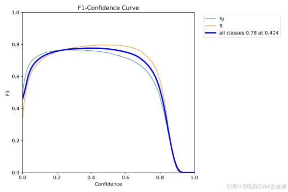由图可知,当confidence为0.404时,all classes的F1分数为0.78;表示该模型在0.404的置信度预测类时整体表现良好,具有一定的准确性和召回率。