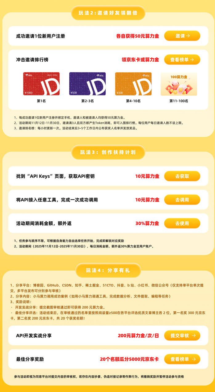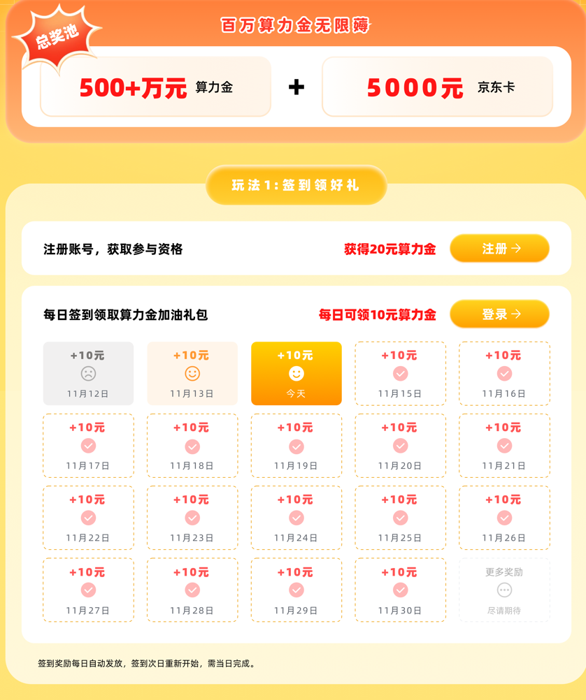 活动玩法:签到领算力、邀请好友领取京东卡、创作扶持、分享有礼