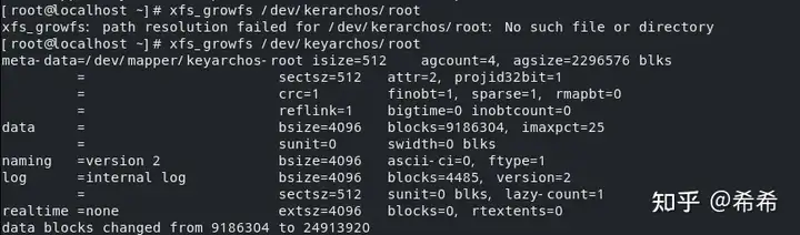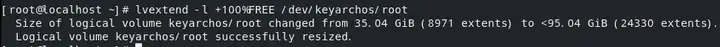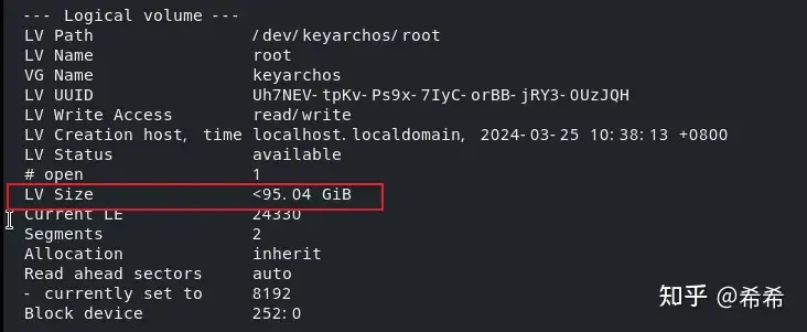1) lvdisplay查看需要扩容的逻辑卷,看到逻辑卷的path为/dev/keyarchos/root
