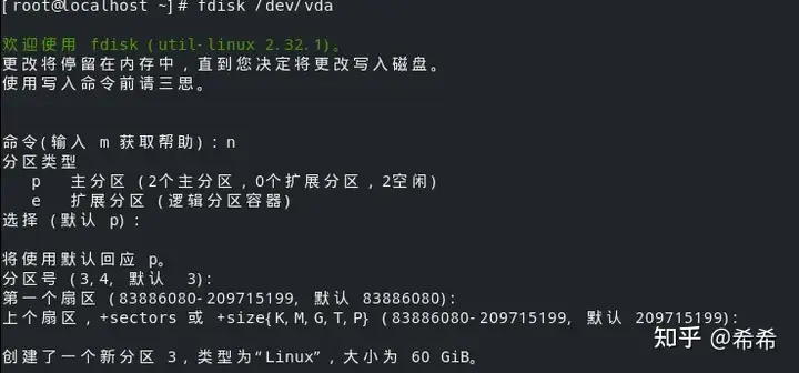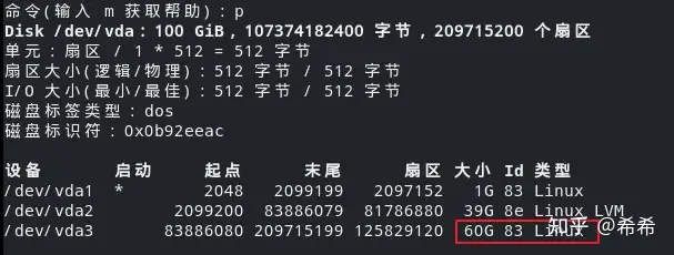 3) 输入p,查看当前分区,可以看到已经新建了一个60G的分区;输入w,回车,保存磁盘信息
