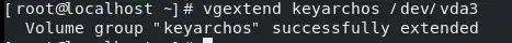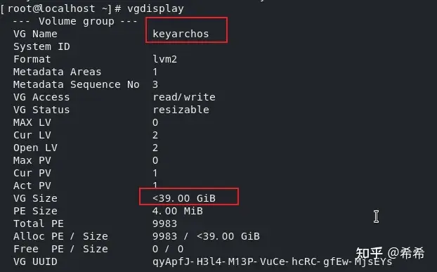 1)查看卷组名称为keyarchos,并且可以查看当前卷组大小