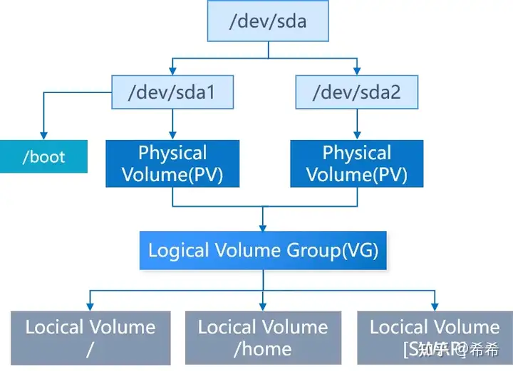LV(logical volume):逻辑卷建立在卷组基础上,卷组中未分配空间可用于建立新的逻辑卷,逻辑卷建立后可以动态扩展和缩小空间。