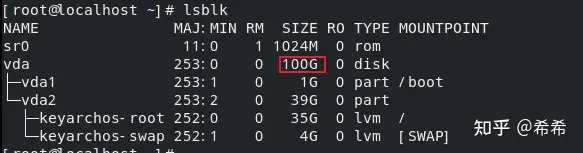 一、打开虚拟机终端,通过df-h可以看到磁盘空间并没有增加,通过lsblk可以看到磁盘空间已经变成100G,原因是没有对磁盘进行LVM扩容,下面将按照上述介绍的方案完成扩容。