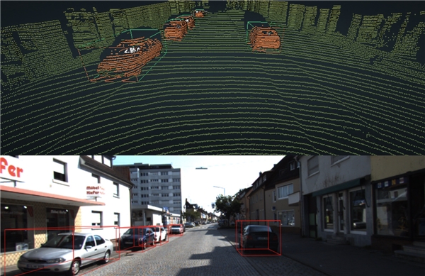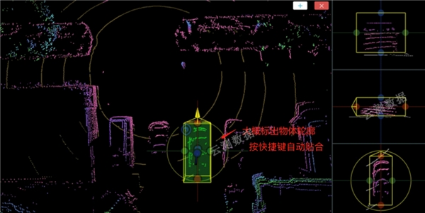 好的AI训练数据平台,在处理多维度数据的层面可以做到视觉,语音,文本,点云等的全品类支撑。以云测数据标注平台4.0为例,可通过“2D3D融合功能”对智能驾驶所需数据类型进行对应的融合标注,将点云中的标注物体通过融合参数映射到2D图中。如下所示: