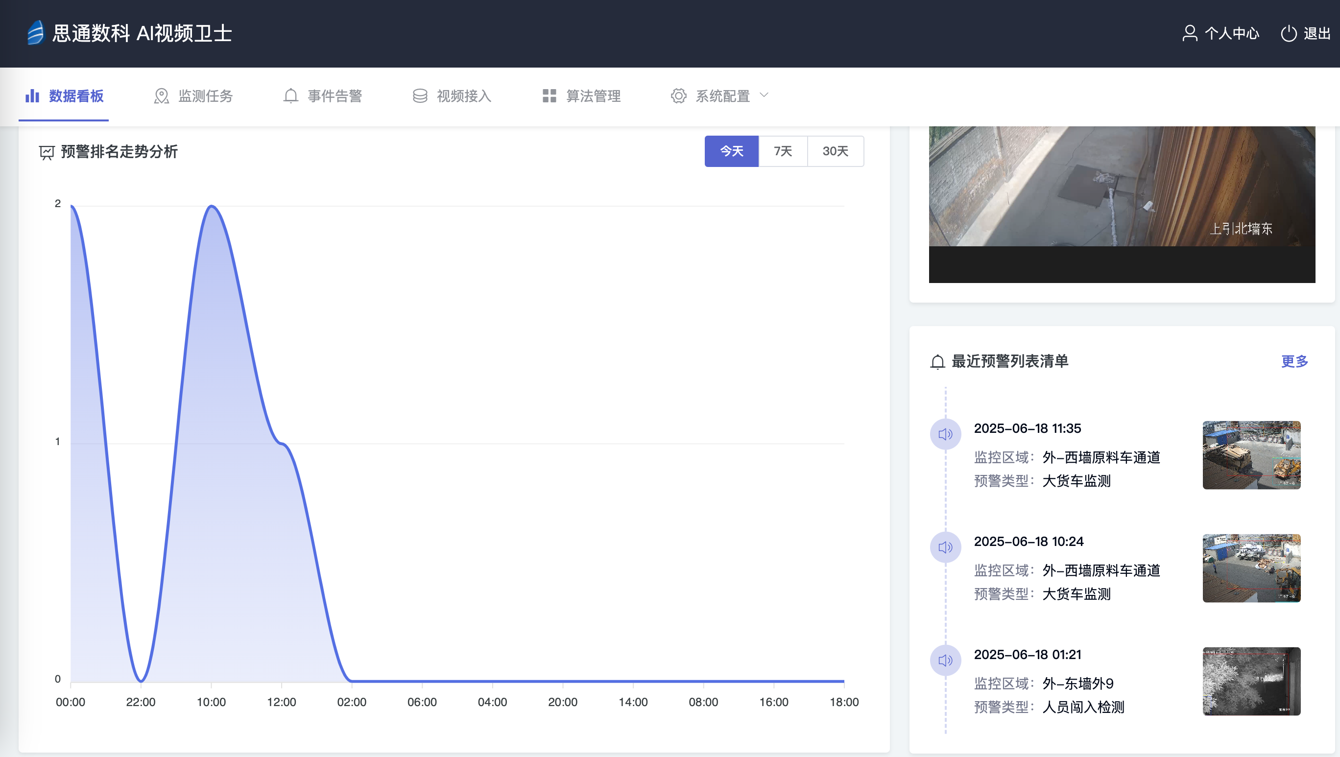 - 边缘计算盒子接入:通过 AI 边缘设备连接新旧摄像头,无需更换线路,直接赋予 “图像识别” 能力 —— 实时分析画面中是否有挖掘机、卡车等重型车辆,判断是否存在挖土方、装载等盗采行为。