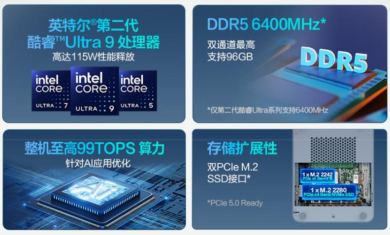 双雷电4(DP 2.1)+双HDMI 2.1,支持四台4K显示器同时输出,金融交易、编程开发等多屏场景轻松驾驭。前置USB 3.2 Type-C与双Type-A接口,支持最新的Wifi7和蓝牙5.4无线技术,配合后置2.5G网口,大文件秒级传输,办公效率UP↑UP↑。双M.2插槽(支持PCIe 5.0),双内存槽(最高96GB DDR5 6400MHz),本地部署大语言AI模型或者是存储海量视频素材都没问题。