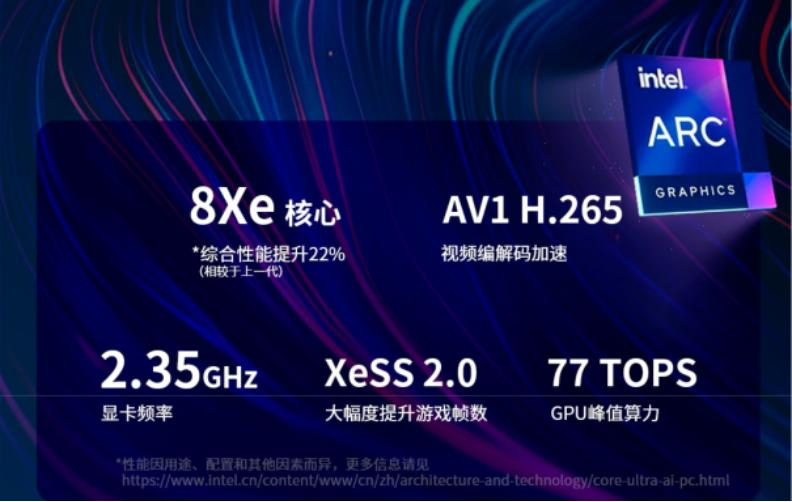 Intel Arc 140T核显,拥有8个Xe核心与光追单元,性能媲美桌面级GTX 1650 Super,《赛博朋克2077》、《黑神话:悟空》1080P画质下稳定50+帧,《CS2》帧率可达76帧,电竞体验丝滑流畅。