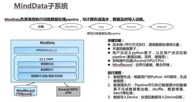 MindData子系统负责高效执行训练数据处理pipeline,与计算形成流水,数据及时导入训练。它的关键功能包括用流水线+并行方式,可提高数据处理吞吐量。还提供自研的数据格式MindRecord,自带元数据,通过聚合存储让数据检索更快。用户还可以自定义Python算子,进行灵活定制。