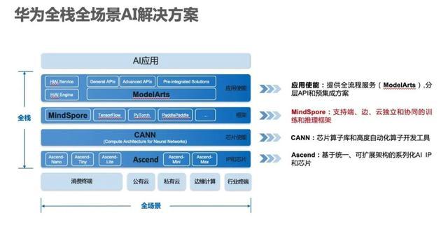 MindSpore对标的是TensorFlow,PyTorch,它对下通过CANN发挥芯片的能力,对上提供网络编程API,以此开发AI应用程序,并且支持ModelArts服务。