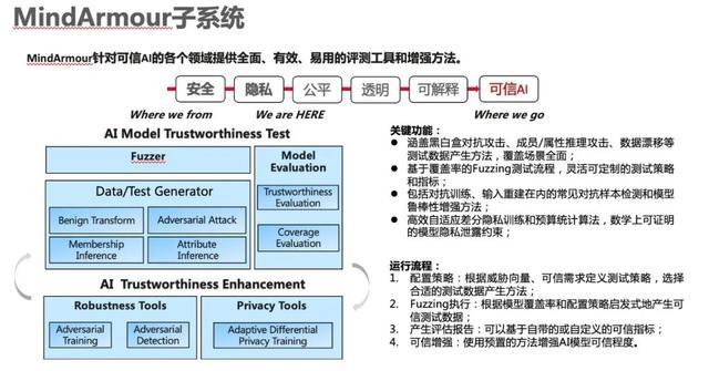 MindArmour子系统可针对可信AI的各个领域提供全面、有效、易用的评测工具和增强方法。一方面,它提供测试框架的建模,用一系列AI模型去验证系统的安全性和隐私保护能力,另一方面,它对一些常用的AI工具提供了标准安全升级手段。