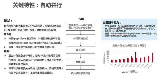 简单网络的常规使用方法就是数据并行,但超大模型与超大数据集的分布式训练,需要通过数据并行+模型并行的混合并行方式,才能高效训练网络。模型切分方式是复杂的,但对外提供简单的API去描述。