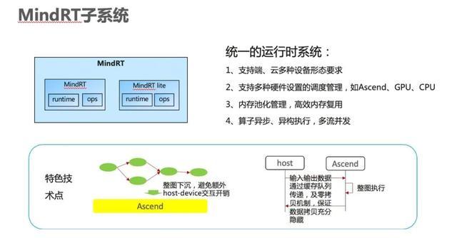 MindRT 子系统是一个统一的运行时系统,支持端、云多种设备形态,支持统一调度管理和内存池化管理,这是复杂网络能在异构硬件上运行的关键技术。它可与昇腾芯片进行深度优化,整图下沉到卡上(on-device执行),减小host-device交互开销,提高深度学习训练的效率。