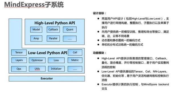MindExpress是一个Python前端,包含High-Level和Low-Level两层API设计,High-Level API提供训练推理接口、混合精度、并行等控制接口,让用户实现整网流程的控制。Low-Level API提供基础的Tensor、优化器等API,而Executor则提供计算的执行控制。