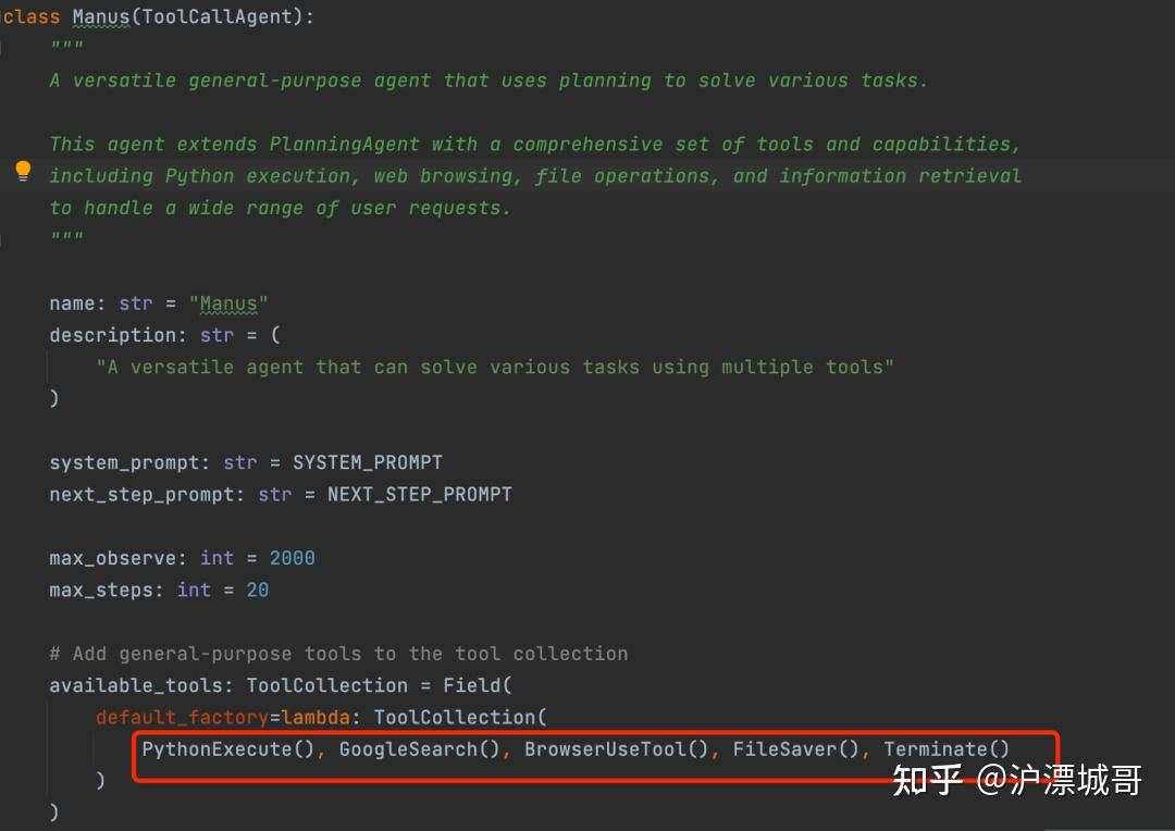 在 available_tools 中定义了 4 个工具,分别是 Python执行器、谷歌搜索、浏览器工具和文件存储。