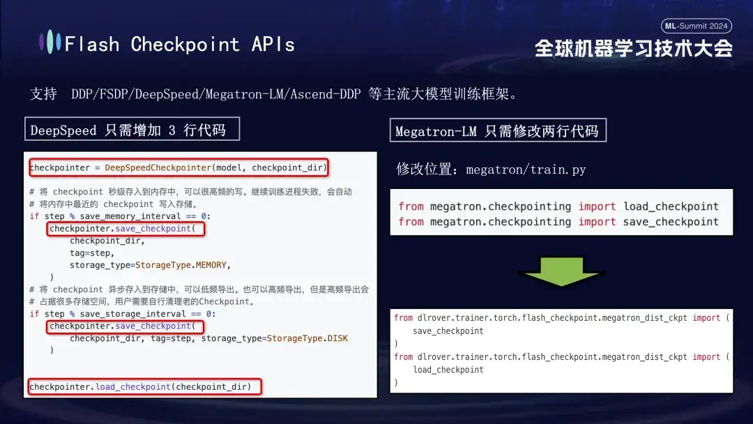 DLRover 的 Flash Checkpoint 特性广泛兼容各大主流大模型训练框架,包括 DDP、FSDP、DeepSpeed、Megatron-LM、transformers.Trainer 以及 Ascend-DDP,为每种框架定制了专属 API,确保了极高的易用性——用户几乎无需调整现有的训练代码,开箱即用。具体而言,DeepSpeed 框架的用户仅需在执行 Checkpoint 时,通过调用 DLRover 的 save 接口来进行,而 Megatron-LM 的集成更为简便,仅需将原生的 Checkpoint 导入语句替换为 DLRover 提供的导入方式即可。