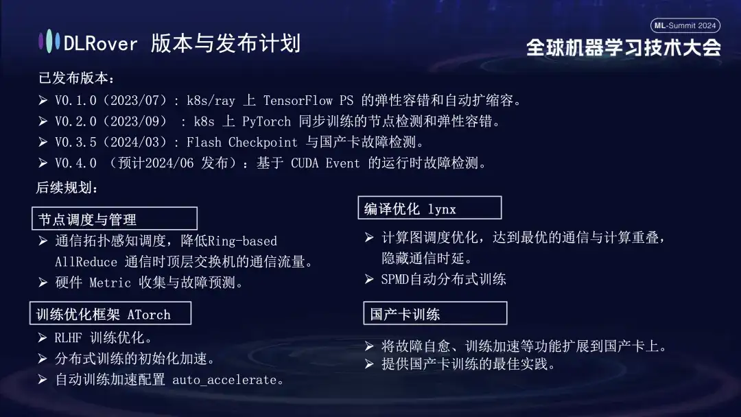未来规划方面,DLRover 会持续在节点调度与管理、编译优化 lynx、训练优化框架 ATorch 和国产卡训练几个方向持续优化和改进 DLRover 的功能: