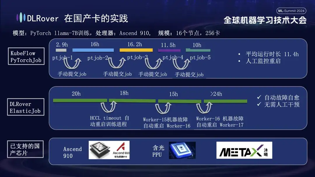 除了支持 GPU,DLRover 故障自愈还支持国产加速卡的分布式训练。例如,我们在华为 Ascend 910 平台上运行 LLama-7B 模型时,采用了 256 张卡进行大规模训练。起初,我们采用的是 KubeFlow 的 PyTorchJob,但该工具不具备容错功能,导致训练进程在持续约十几个小时后会自动终止,一旦发生这种情况,用户必须手动重新提交任务;否则,集群资源将处于闲置状态。第二个图表描绘了在启用训练故障自愈功能后的整个训练过程。在训练进行到 20 小时的时候,出现了一次通信 timeout 故障,此时系统自动重启了训练进程并恢复训练。大约四十多个小时后,遇到一次机器硬件故障,系统迅速隔离故障机器并重启了一个 pod 继续训练。除了对华为 Ascend 910 的支持,我们还兼容了阿里的含光 PPU,并与沐曦科技合作,在其自主研发的 千卡 GPU 上运用 DLRover 进行训练 LLAMA2-65B 模型。