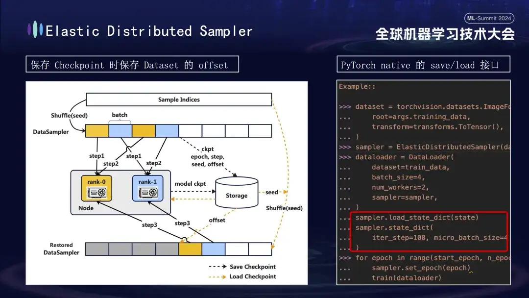 在进行模型 Checkpoint 的创建时,还有一个细节值得留意。模型的训练基于数据,假设我们在训练进程的第 1000 步保存了 Checkpoint。如果之后重新启动训练但未考虑数据进度,直接从头开始重新消费数据将导致两个问题:后续新数据可能被遗漏,同时前期数据可能会被重复使用。为解决这一问题,我们引入了 Distributed Sampler 策略。该策略在保存 Checkpoint 时,不仅记录模型状态,还会一并保存数据读取的偏移位置。这样一来,当加载 Checkpoint 恢复训练时,数据集会从之前保存的偏移点继续加载,继而推进训练,从而确保模型训练数据的连续性和一致性,避免了数据的错漏或重复处理。