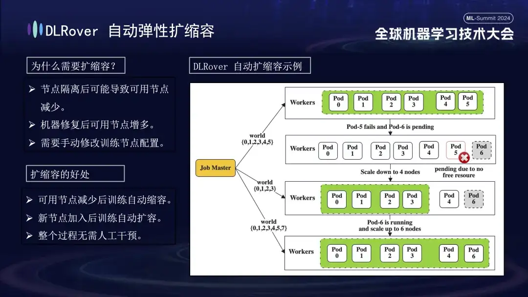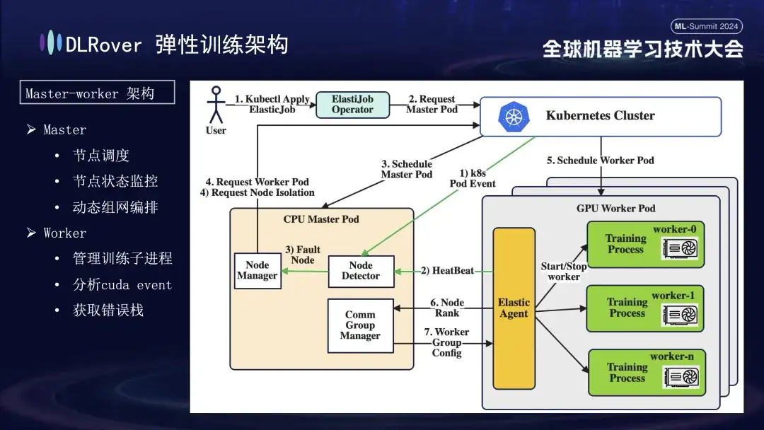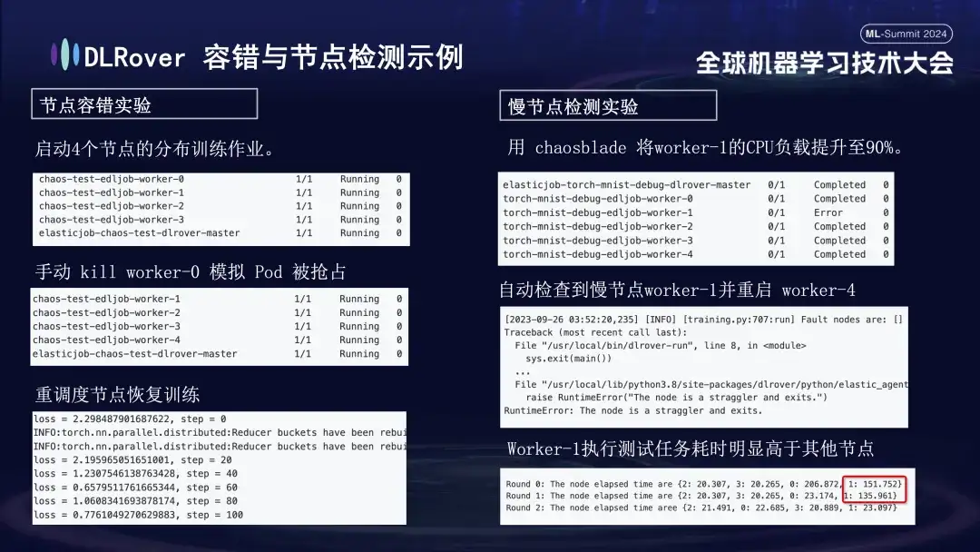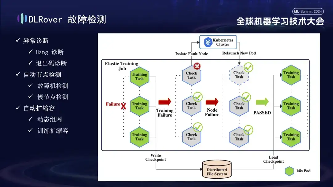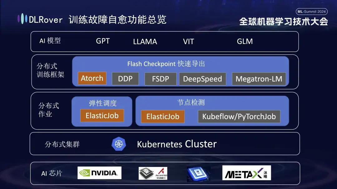 分布式全链路因果学习系统 OpenASCE:大模型驱动的知识图谱 OpenSPG:大规模图学习系统 OpenAGL:4 月 25、26 日,全球机器学习技术大会在上海环球港凯悦大酒店举行!蚂蚁集团 DLRover 开源负责人王勤龙在大会上发表了《DLRover 训练故障自愈:大幅提升大规模 AI 训练的算力效率》主题演讲,分享如何在千卡规模大模型训练作业下,快速故障自愈,王勤龙介绍了 DLRove