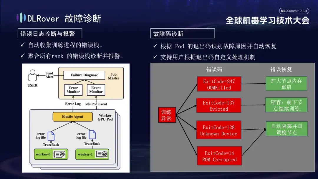 - 首先,Agent 收集各训练进程的错误信息,将这些错误栈汇总至 master 节点。随后,master 节点分析汇总的错误数据,以准确定位问题所在机器。例如,若某机器日志显示 ECC 错误,则直接判定该机器故障并将其排除。